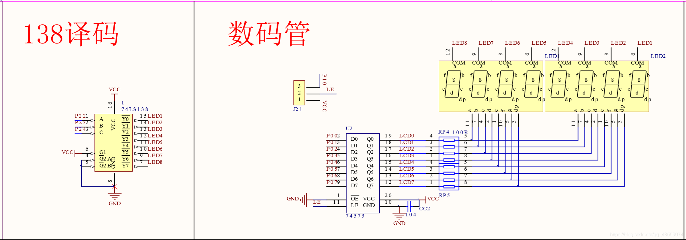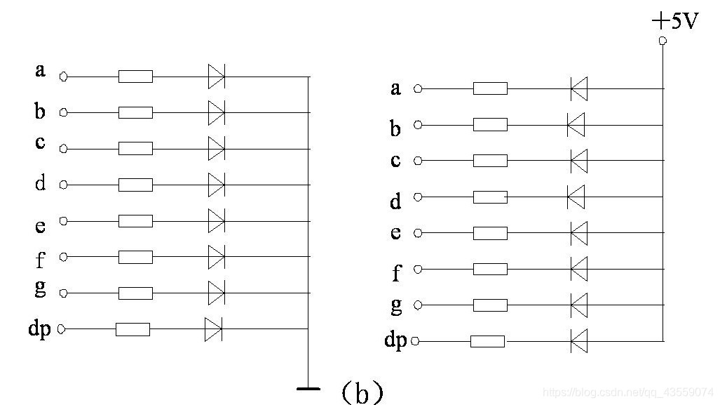 这八个LED连接的方法有两种,共阴极和共阳极,下图左边是共阴极,右边是共阳极